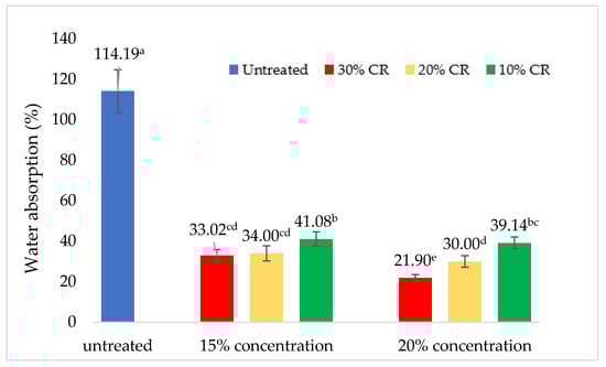 As seen in Figure 3, the increased PF resin concentrations from 15% to 20%, and compression ratios resulted in reduced WA values of the treated OPW. The untreated OPW exhibited an extremely high WA value of 114.19%, due to the high-water absorption capacity of parenchyma tissue. After compregnation, the WA of the OPW reduced from 21.90% to 41.08%. Although OPW is known to be an unstable material due to its anatomical features, which allows for excessive moisture absorption, compreg treatment significantly reduced its WA. The samples treated with 20% PF resin concentration and 30% CR had the lowest WA of 21.90%.