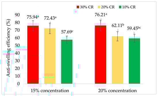 In this study, the ASE values of the compreg OPW varied from 75.94% to 57.69% for the samples treated with 15% PF resin concentration, and from 76.21% to 59.45% for the samples treated with 20% resin concentration, respectively (Figure 4). In terms of CR, it is demonstrated that ASE increased in tandem with CR, i.e., the higher the CR ratio, the higher the ASE values. The highest ASE value of 76.21% was recorded in the samples treated with 20% PF resin concentration and 30% CR.