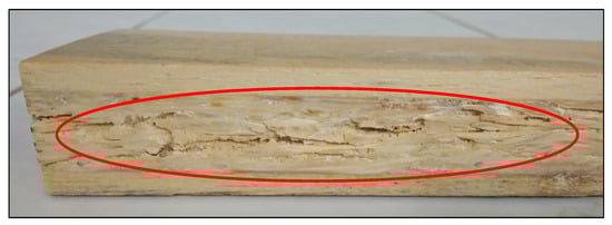 The high initial moisture level of the compreg inner OPW samples resulted in compression failure. After impregnation treatment, the assembled samples had a moisture content of 60%, which might have been relatively high when the samples were being subjected to compression in a hot press. In the case of compreg inner OPW in phase 1, moisture on wood surfaces, according to Haque [34], can either vaporize or penetrate into the wood during heating. During compression, the moisture was heated, causing it to evaporate. Water vapor from the inner OPW can easily escape through any direction of wood to the sample surface during compression (Figure 6).