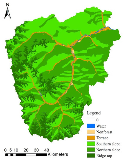 The LANDIS model divides the heterogeneous landscape into relatively homogeneous land-cover type units. The same land type is assumed to have the same environmental conditions. We classified the study area into six land types: non-forest, water, terrace, southern slope, northern slope, and ridge top (>1000 m). Non-forested land type and water areas were obtained from the 1990 forest stand map of the Huzhong Forestry Bureau. The southern and northern slopes were divided according to the slope direction from the DEM. The ridge top and terrace were further determined by calculating the elevation from the DEM. Non-forest and water accounted for 0.82% of the total area. Terrace, southern slope, northern slope, and ridge top areas accounted for 4.95%, 38.41%, 45.19%, and 10.61%, respectively. The land type map was also sampled to a 90 m × 90 m resolution (Figure 2).