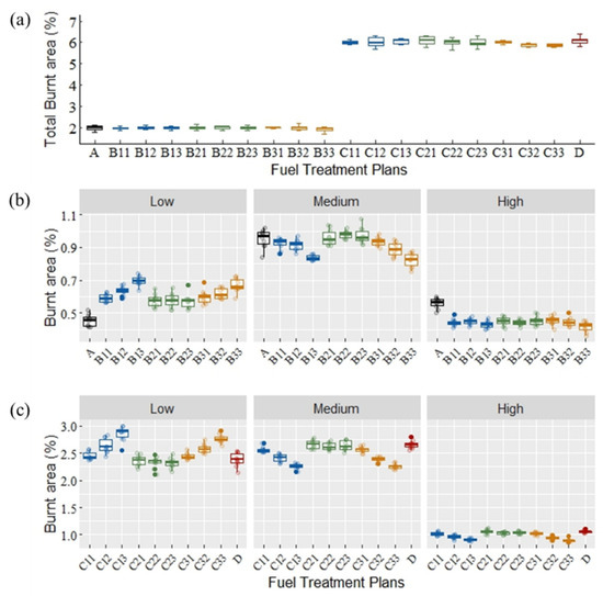 By comparing scenario C with scenario D, the fuel treatment effects under the no fire suppression policy could be explored. The results showed that the total burnt area for the nine fuel treatment plans showed no obvious difference from scenario D (p = 0.213) (Figure 3a). Unlike the results of the fuel treatments under the CFS scenario, the coarse woody debris reduction (C11, C12, C13) and coarse woody debris reduction plus prescribed burning (C31, C32, C33) under the NFS scenario could obviously reduce the area burnt by medium- and high-intensity fires, while prescribed burning (C21, C22, C23) did not have a significant effect (Figure 3c).