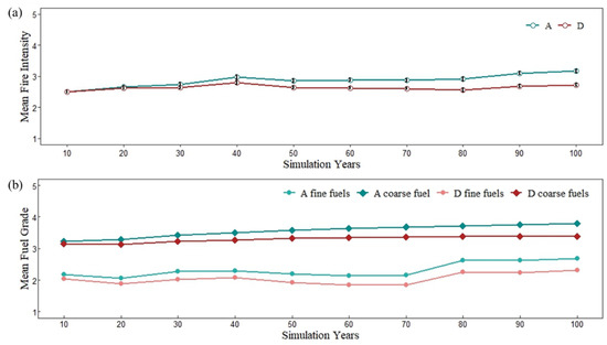 Mean fire intensity (a) and mean fuel loads grade (b) under scenario A and scenario D.