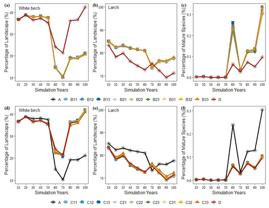 Percentage of landscape and percentage of mature age species for all scenarios. Scenario A and scenario D are the baseline scenarios for comparison, and they do not treat for fuels. (a–c) are the PLAND for white birch, the PLAND for larch, and MAS under the nine fuel treatment plans included in scenario B, respectively. (d–f) are the PLAND for white birch, the PLAND for larch, and MAS under the nine fuel treatment plans included in scenario C.