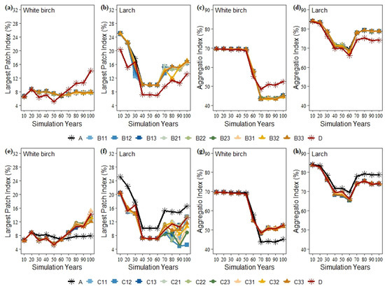Largest patch index (LPI) and aggregation index (AI) for all scenarios. Scenario A and scenario D are the baseline scenarios for comparison, and they do not treat for fuels. (a,b) are the LPIs for white birch and larch, respectively, under the nine fuel treatment plans in scenario B. (c,d) are the AI of white birch and larch, respectively, under the nine fuel treatment plans in scenario B. and (e,f) are LPI for white birch and larch, respectively, under the nine fuel treatment plans in scenario C. (g,h) are the AI of white birch and larch, respectively, under the nine fuel treatment plans in scenario C.