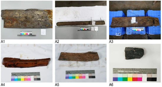 Images of the original states of the waterlogged archaeological wood samples. ((A1–A5) were collected from Nanhai No. 1; (A6) was collected from Changjiangkou No. 2).