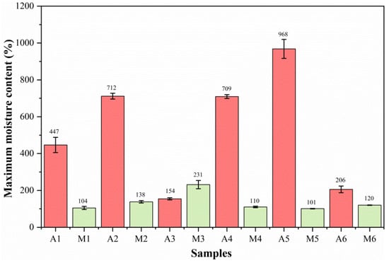 The maximum water content (MWC) of waterlogged archaeological wood samples (A1–6) and modern samples (M1–6).