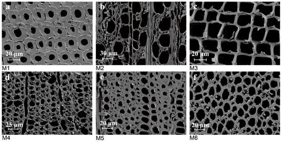 Scanning electron micrographs of waterlogged archaeological wood ((a), mason pine; (b), sweet gum; (c), fir; (d), persimmon; (e), banyan; (f), teak).
