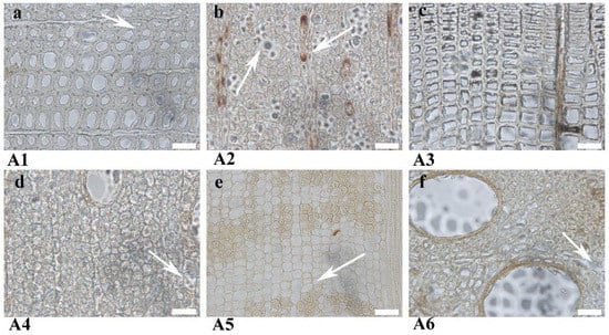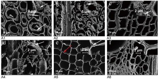 The MWC values of A3 (Chinese fir) and A6 (teak) samples were 154% and 206%, respectively, lower than 225% in De Jong’s criteria. Moreover, the cell walls showed slight degradation (Figure 4c,f). Therefore, A3 and A6 samples were classified as slightly deteriorated. As can be seen from the microscope images, A3 showed almost no decaying cells, but A6 showed signs of microbial degradation (Figure 5c,f). The MWC value of the A1 (pine) sample was 447%, between 350 and 500% in De Jong’s criteria. The MWC reached as much as four times that of modern wood. Sample A1 showed microbial degradation in the SEM image, with the secondary walls being porous and separated from the intercellular layer (Figure 4a). Invasion by fungi and bacteria was evident from the microscope images, and the cell walls were granular (Figure 5a). Therefore, A1 was classified as moderately deteriorated. The A2 (Sweetgum), A4 (Persimmon), and A5 (Babian) samples have MWC values ranging from 709% to 968%, which is higher than 500% in De Jong’s criteria; the MWC reaches five to nine times that of modern wood. These samples show higher degrees of deterioration based on the SEM images compared to A1. Pores appear in the secondary wall and separate from the intercellular layer (Figure 4b,d). The secondary wall may disappear in more advanced stages of deterioration (Figure 4e). Bacterial and fungal attack was evident and widespread in the severely degraded samples by microscopy images (Figure 5b,d,e). In addition, microbial degradation products were found in the ray cell cavity in A2, the cell wall of A4 is granular and amorphous, and the disappearance of the S2 layer was found in A5. Therefore, A2, A4, and A5 samples were determined to be seriously deteriorated.