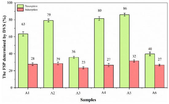 The DVS-determined FSP values of waterlogged archaeological wood samples are shown in Figure 7. The FSP values measured during the adsorption process ranged from 23% to 32%, while those during the desorption process ranged from 36% to 86%. Moreover, the difference between the desorption and adsorption process FSP values was smaller for the samples that were slightly deteriorated than those that were moderately and seriously deteriorated. This difference is due to moderately and seriously deteriorated waterlogged archaeological wood hemicellulose fibers and cellulose being more degraded and having lower cell wall strength []. Therefore, the FSP determined by the adsorption process is not suitable for FSP analysis of waterlogged archaeological wood.