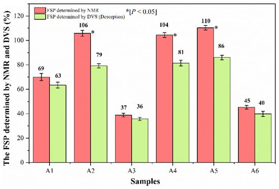 FSP determined by NMR and DVS significant differences were analyzed by statistical analysis with Microsoft Excel (Microsoft, Redmond, WA, USA). Differences between the FSP values determined by MNR and DVS were analyzed by t-test, and significant differences were assessed at a threshold of p < 0.05.