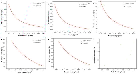 The relationship between the content of different types of moisture and the basic density ((a–c), waterlogged archaeological wood; (d–f), modern wood). Note: the values in the figure are the average values of three experimental tests and calculations.