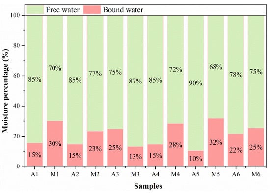The ratio of bound water and free water to the maximum water content (MWC) in waterlogged archaeological wood (A1–6) and modern wood (M1–6). Note: the values in the figure are the average values of three experimental tests and calculations.