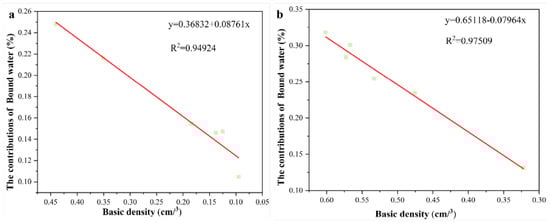 The relationship between the bound water contribution ratio and the basic density ((a), waterlogged archaeological wood; (b), modern wood). Note: the values in the figure are the average values of three experimental tests and calculations.