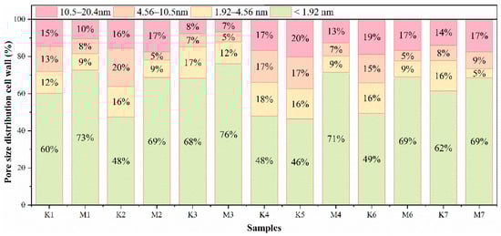 where Sa, Sb, and Sc are the NMR signal amplitude of the sample at a temperature a, b, and critical temperature, respectively. Sn represents the total number of pores in the cell wall. The total number of pores in the cell wall in any range was (Sa − Sb)/Sc. In this study, 243 K is the lowest temperature, the corresponding pore size is 1.9 nm, and the proportion of pore size less than 1.9 nm is S243K/Sc.