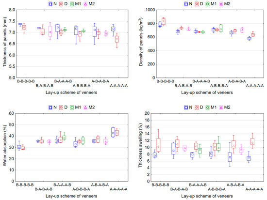 Effect of wood veneer species and type of veneer treatment on the physical properties of plywood panels. N—non-densified veneers in one panel; D—densified veneer in one panel; M1—mix of veneers (D–N–N–N–D) in one panel; M2—mix of veneers (D–N–D–N–D) in one panel; Statistical features are median, 25% minimum and 75% maximum.