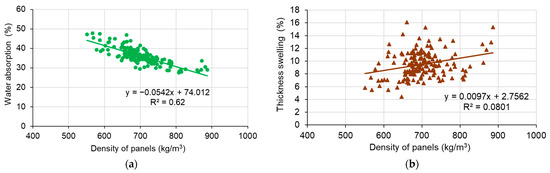 Influence of density on water absorption (a) and thickness swelling (b) of plywood samples.