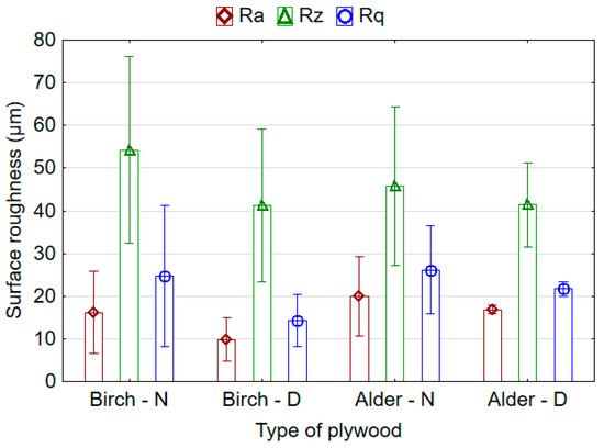 The surface roughness of plywood panels with outer layers of non-densified and densified birch and alder veneer was also compared (Figure 3). In addition to the fact that plywood with outer layers of alder veneer had lower values of MOR and MOE (Table 5), the surface of such plywood also had a greater surface roughness compared to the birch plywood (Figure 3). It was found that for plywood made of non-densified alder veneer (AN–AN–AN–AN–AN), the roughness parameters Ra and Rq were 19.4% and 5.4% greater, respectively, than the similar parameters for plywood made of non-densified birch veneer (BN–BN–BN–BN–BN). On the contrary, the roughness parameter Rz for plywood made of non-densified alder veneer was 18.3% lower than for plywood made of non-densified birch veneer. For plywood made of densified alder veneer, the roughness parameters Ra, Rz and Rq were 41.6%, 0.4% and 14.2% higher than similar parameters for plywood made of densified birch veneer, respectively. This was logical, as birch wood has less porosity than alder wood. However, the differences in Ra, Rz and Rq found between non-densified/densified birch and alder veneers were statistically insignificant. Nevertheless, the thermal compression led to a decrease in the surface roughness values for both the birch and alder veneers. In our previous work [10], we also found that the surface of wood veneers became smoother and roughness values decreased significantly due to the thermal densification process.