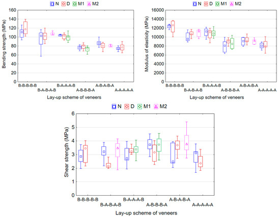 Higher values of shear strength were observed in mixed-species plywood panels with alternating sheets of densified and non-densified veneers in adjacent layers (panels BD–AN–AN–AN–BD, AD–BN–BN–BN–AD, BD–AN–BD–AN–BD and AD–BN–AD–BN–AD). In our previous work [27], it was also observed that using densified veneers increased the mechanical performance of plywood panels, but worsened the TS and WA of panels.