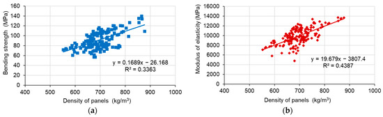 Figure 5 shows the linear dependence of the MOR and MOE of plywood samples on their density. These dependences were not strong, which indicates that, in addition to density, other factors, such as the veneer thickness, species and type and amount of adhesive used, affected the MOR and MOE. In another work [39], it was also observed that the MOR and MOE of plywood panels made from densified and non-densified veneers increased when the density increased.