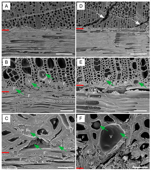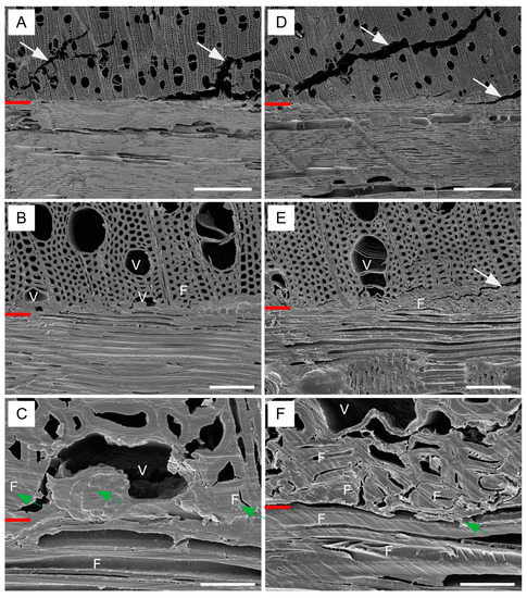 SEM observation of bond line in alder plywood. (A–C)—non-densified veneers (panel VI); (D–F)—densified veneers (panel XVI); V—vessel, F—fiber, red line—bond line, white arrow—crack, green arrow—glue. Scale bar: (A,D) = 500 µm, (B,E) = 100 µm, (C,F) = 20 µm.