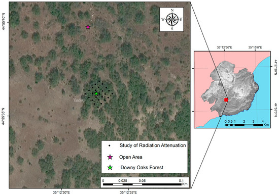 In order to elucidate the intricacies of the heat balance and the distribution of heat fluxes within the forest landscapes of Southeastern Crimea [60], a key study site was selected, namely the downy oak forest, which represents a typical community type in this region. Situated within the territory of the Karadag Nature Reserve, this forest is located on the eastern-facing slope of the Besh-Tash ridge (Figure 1).