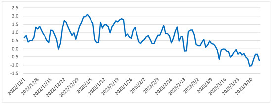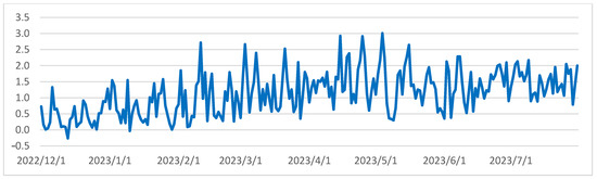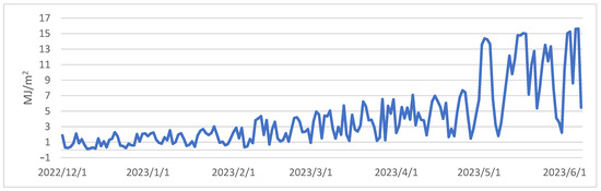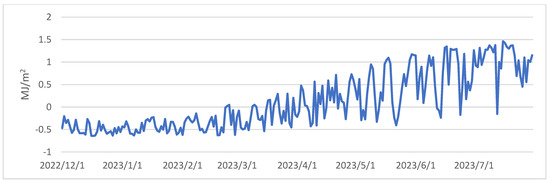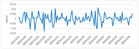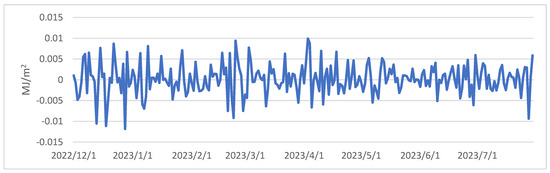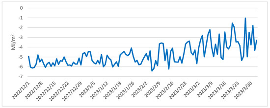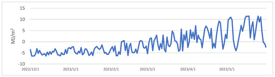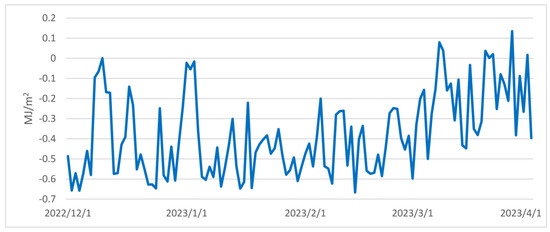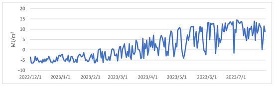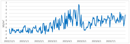 As shown in Figure 2, a discernible pattern emerges from the progression of daily average radiation balance values spanning the period from 1 December 2022 to 31 July 2023. Analysis of the daily variations throughout the winter, spring, and summer seasons reveals that positive balance values are prevalent during daylight hours, whereas negative values dominate during nighttime (Figure 3). It is important to note that due to the reduced daylight hours and the lower solar angle during winter, minor positive balance values are confined to a short timeframe, occurring between 1 pm and 5 pm. With the lengthening of daylight hours and the higher solar position during spring, there is a noticeable upswing in both the magnitude of positive radiation balance values and their duration. In summer, the values exhibit further escalation, and their alterations manifest a smoother progression.