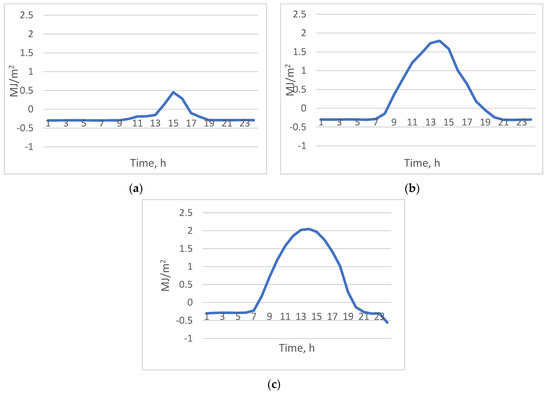 Radiation balance in: (a)—winter (17 January), (b)—spring (15 April), (c)—summer (6 June).