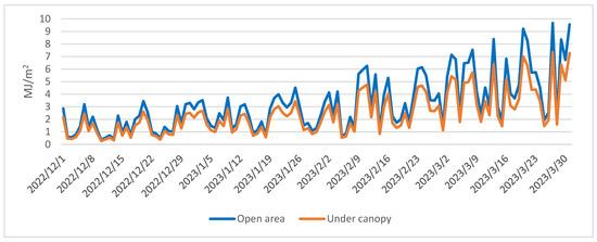 The obtained results shed light on the primary trends within the radiation balance and offer insights into its seasonal, monthly, and daily dynamics. Figure 2 depicts the daily averages of radiation balance recorded within the open area encompassed by the downy oak forest from 1 December 2022 to 31 July 2023.