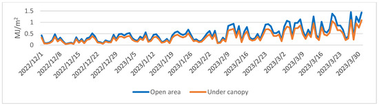 The quantity of evaporation on the open site was measured using the sensor module of the Davis Vantage Pro2 weather station (Hayward, CA, USA). To estimate evaporation within the forested area, the following equation was employed [1]:
