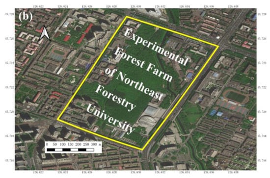Our research was carried out at the Northeast Forestry University’s experimental forest farm in Harbin City (126.62° E, 45.76° N) (Figure 1). On average, this area is 142 m above sea level. A private Belarussian botanical garden was constructed in 1930, and the experimental forest farm was divided into various sections for experimental afforestation in the 1950s and 1960s. It has natural soil, or zonal chernozem, with flat topography and ideal moisture levels. There were no changes in land use after afforestation. It was a good location for this experiment due to the topography, which is a flat plain, and because detailed historical information about this area exists. In-depth descriptions of tree planting and species composition have been provided in earlier studies [29,30]. With high summer temperatures and significant summertime precipitation, but a chilly, dry winter, Harbin has a mid-temperate continental monsoon climate. The annual cumulative averages of both temperature and precipitation are 3.5 °C and 534 mm, respectively.
