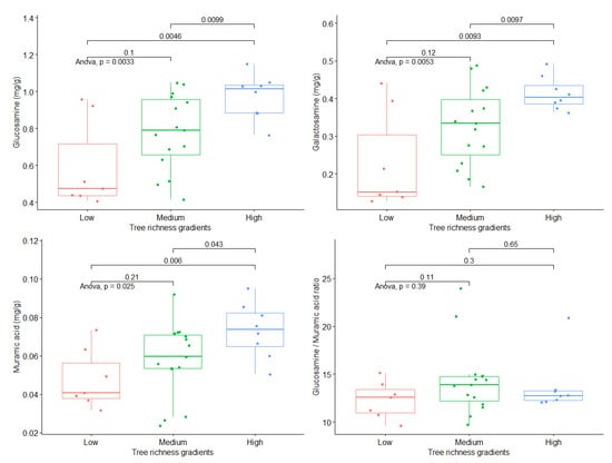 For each independent variable, we divided the number of tree species into low, medium, and high groups. To compare the differences in microbial biomarker contents under low, medium, and high tree species richness groups, a one-way analysis of variance (ANOVA) with a t-test was used. From the low to the high tree species richness gradients, the contents of glucosamine, galactosamine, and muramic acid showed an increasing trend (p < 0.05; Figure 2), but the ratio of glucosamine to muramic acid did not change significantly.