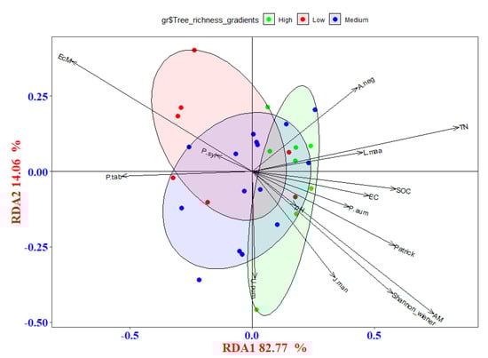 The redundancy analysis (RDA) for fungi- and bacteria-derived residues and the environment factors. The effect variables are represented by grey arrows. Green dots and circle coverage, blue dots and circle coverage, and red dots and circle coverage show amino sugar contents at high-, medium-, and low- diversity gradients, respectively. EC: soil conductivity; pH: soil pH value; SOC: soil organic carbon content; TN: total soil nitrogen content; Patrick, Shannon-Wiener, Simpson, and Pielou represent the different diversity indexes in different plots. P. syl, F. man, P. amu, Q. mon, J. man, U. pum, L. maa, P. tab, and A. neg representhe importance values of different tree species in different plots.