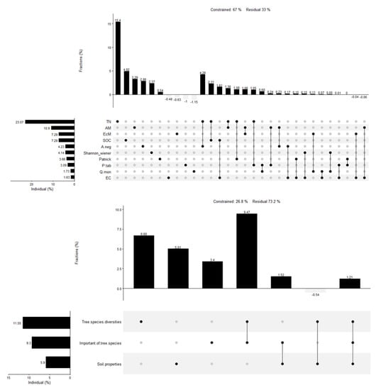 To determine the contribution of the individual groups or individual environmental factors to the variations in the fungi- and bacteria-derived residues, we conducted hierarchical partitioning analysis (Figure 4). The results showed that species diversity, tree species’ importance values and soil properties significantly affected fungi- and bacteria-derived residues (p < 0.05), and three group variables accounted for a total of 26.75% of the variation. Tree species diversity and the importance values of tree species had a high proportion of common effects (9.47%).