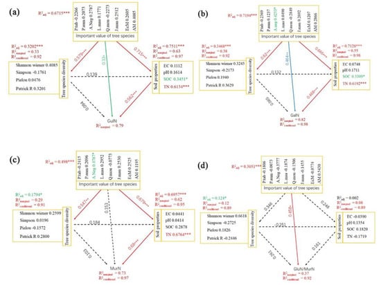 We used “piecewise SEM” to further evaluate the direct and indirect effects of soil properties, tree species diversity, and the importance value of tree species on variations in GluN (a), GlaN (b), MurN (c), and GluN/MurN (d) [42,43] All environmental variables included in these models were also first divided into three groups, as in the upper Mantel test. In the linear mixed effect model of environmental group effects, we assumed that the importance values of tree species affect tree species diversity and then soil properties. We placed soil properties, tree species diversity, and the importance values of tree species in sequence. The models were carried out using the “piecewise SEM” package for linear mixed effect models based on the “nlme” package. We modified our models with the significance (P0.05) and the model goodness using Fisher’s C-test (when 0.05P1.00), which we used to confirm the accuracy of the modeling results Chen, 2017 [44].