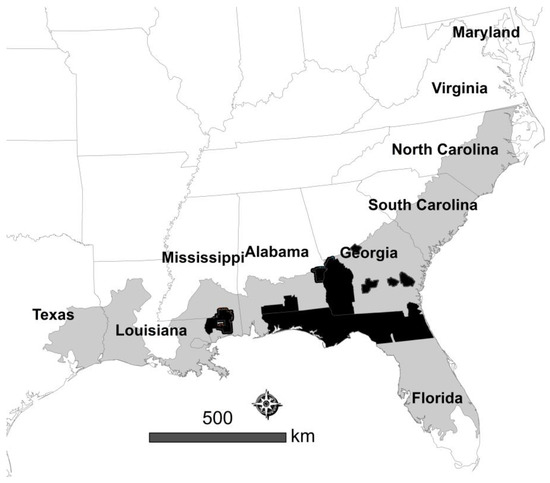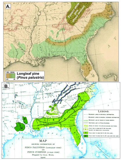 Widespread adoption of forest management practices, such as fire exclusion, preferences for quicker-yielding species, and denser stands to increase timber production have transformed North America for centuries [1,2]. For instance, the forests of the Outer Coastal Plain Mixed Forest Province (hereafter, Coastal Plain), an ecological region that covers about 56 million ha of the United States [3] are today different than those formerly dominated by longleaf pine (Pinus palustris; [4,5,6,7]). Two centuries ago, longleaf pine was the primary tree species across tens of millions of hectares and a prominent component of millions of additional hectares of this province (Figure 1; [4,8,9,10]). Indeed, most of the earliest explorers to this region marveled at this vast timber resource [11,12,13], estimated by Mattoon (1922; [14]) to once contain nearly 2.3 billion cubic meters of merchantable longleaf pine. Not surprisingly, then, longleaf pine forests were crucial to the socioeconomic well-being of the United States for many decades [5,15,16].