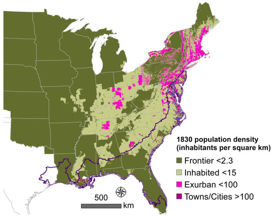 Euro-American settlement during 1830 in the Unites States (Texas annexed during 1845; Coastal Plain ecological province outlined in purple; adapted from [65]).