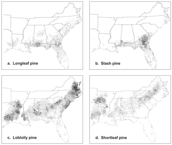 By the early to mid-1950s, the Forest Service regional forest survey information started to show the decreased dominance of longleaf pine (a) in the Coastal Plain, coupled with increases in the other southern pines (b–d). This figure, adapted from [84], used dot maps (at the county level) to describe the abundance of trees in terms of merchantable volumes as determined from forest surveys conducted between 1947–1957. Each dot represents 141,584 m3 of merchantable wood (assuming 1 m3 = 35.3147 ft3 and one dot = 5,000,000 ft3).