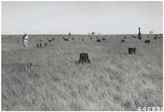 Likewise, the influence of herbivory by native fauna and then later livestock was consequential in past forests. Research of herbivory as a primary ecological driver of historical forests has been inconclusive, but the influence of large herbivores likely declined following megaherbivore extinctions after human arrival [23,121,122,123,124]. White-tailed deer (Odocoileus virginianus Zimm.), eastern elk (Cervus canadensis canadensis Erxleben), and American bison (Bison bison L.) traversed eastern landscapes at various densities and intensities, acting as powerful stabilizers of the open state through their herbivory and other site-impacting activities [125]. Their eventual replacement by the domesticated livestock of Euro-American settlers helped to offset the loss or dramatic reduction of large native herbivores, but only until grazing and related burning practices became too intensive to sustain regeneration of the longleaf pine community (Figure 8).