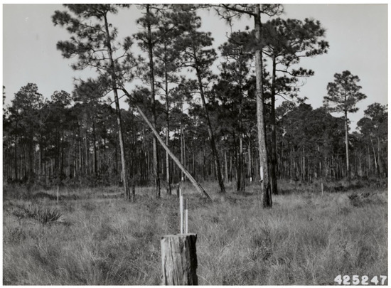 Actions taken to address earlier land management problems often led to further longleaf pine declines. Early work often proved counter-productive in sustaining this resource. In part as a response to the widespread loss of longleaf pine forests, the USDA Forest Service opened its Southern Forest Experiment Station (SOFES) in 1921 [52,126,127]. For decades, prominent SOFES scientists generally thought the benefits of fire and grazing in natural or planted pines did not outweigh the costs, even with some modest exceptions for longleaf pine [55,82]. In dismissing compelling evidence of the benefits of properly applied and suitably frequent fire in longleaf pine, SOFES recommendations were largely consistent with the Forest Service’s then-discouragement of fire as a management tool for southern pines in order to ameliorate perceived negative effects of burning on regeneration, stocking, and tree log quality in second-growth Coastal Plain pine stands. These early federal research efforts also produced evidence of better individual tree and stand-level growth and yield of unburned loblolly and slash pines [9,76,101,128,129]. These studies supported later work on southern pine productivity in the first widespread inventories of the Coastal Plain [83] and then, the development of management treatments unfavorable to the previously preferred longleaf pine. While research to improve the success of longleaf pine never disappeared [116,126,130,131,132], more effort was invested into silvicultural research in the other southern pines that further encouraged their widespread use and sped the demise of longleaf [133]. For example, early reforestation efforts often failed regardless of species, but SOFES researchers, company foresters, and landowners also quickly realized that extra difficulty of securing longleaf regeneration, coupled with its slower initial growth (due to the grass stage) favored other options [17,51].