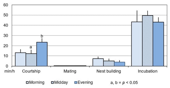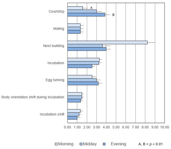 The only significant difference (p < 0.01) was found for courtship between the morning (1.57) and evening (3.86) (Figure 2).