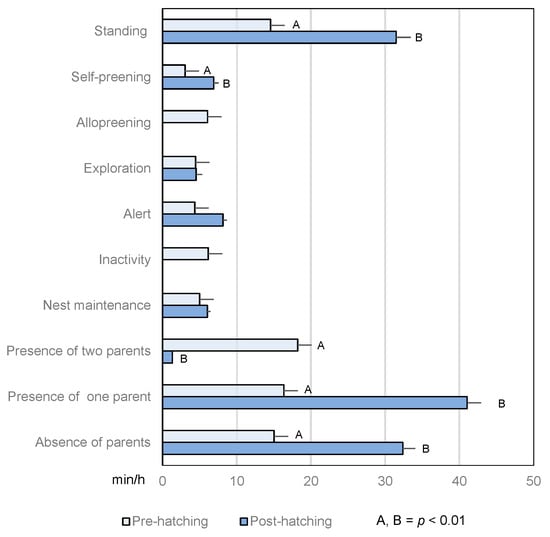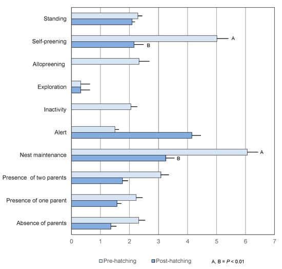 Duration and/or frequency of the observed activities during the pre- and post-hatching phases.