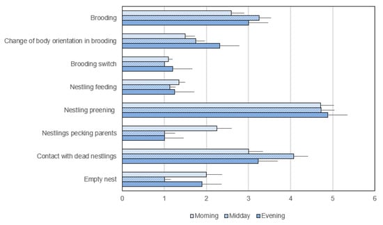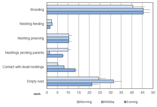 In the post-hatching phase, the parents were very busy in caring for the nestlings (Figure A6 and Figure A7) (Video S1). The time spent brooding was over 40 min/h in the morning and over 45 min/h at midday and in the evening (Figure 5); this time seems to decrease with the growth of the offspring.