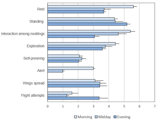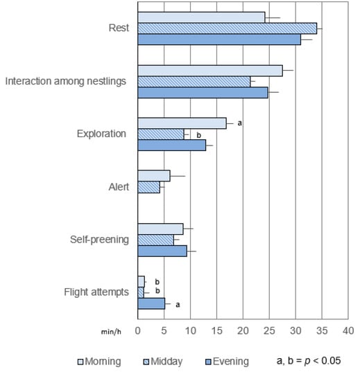 The timing of interaction among nestlings was significantly higher (p < 0.05) in the morning (27.51′) than at midday (21.45′). The hourly alert status was observed for 6.17′ in the evening and for 4.17′ at midday, while it was absent in the evening. In the last ten days before fledging, the two surviving nestlings (Figure A8) spent more than 5′ in the evening and only about 1′ in the morning and at midday during their flight attempts. The walking and exploration times were very similar, as these two activities are interrelated.