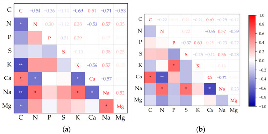 Pearson correlation analysis among plant leaf chemical traits in high and low soil water and salinity habitat. (a) high soil water and salinity habitat; (b) low soil water and salinity habitat. Note: * p ≤ 0.05; ** p ≤ 0.01.