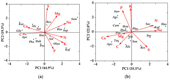 Principal component analysis of plant leaf chemical traits in high and low soil water and salinity habitat. (a) high soil water and salinity habitat; (b) low soil water and salinity habitat. Als—Alhagi sparsifolia; Ags—Agriophyllum squarrosum; Apv—Apocynum venetum; Cam—Calligonum mongolicum; Hou—Horaninowia ulicina; Glu—Glycyrrhiza uralensis; Hac—Halostachys caspica; Hah—Halimodendron halodendron; Has—Halocnemum strobilaceum; Kac—Karelinia caspica; Kaf—Kalidium foliatum; Nit—Nitraria tangutorum; Pha—Phragmites australis; Res—Reaumuria songarica; Saa—Salsola aperta; Sac—Salsola collina; Sum—Suaeda microphylla; Sup—Suaeda prostrata; Sar—Salsola ruthenica; Tar—Tamarix ramosissima; Sus—Suaeda salsa; Haa—Haloxylon ammodendron; Sup—Suaeda prostrata.