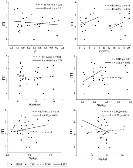 Under low soil water and salinity habitat, SVWC, N, and P were positively correlated with ITI, with N having the highest strength of linear fit for ITI and K being negatively correlated with ITI with a higher strength of linear fit. Under high soil water and salinity levels, all soil factors except P were positively correlated with ITI, with SVWC having the highest linear fit strength for ITI. Overall, SVWC had the strongest linear fit to ITI, and EC had the weakest linear fit to ITI in both soil water-salinity habitats (Figure 3).