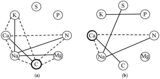 The plant trait network showed a stronger association of plant leaf chemical traits in high soil water-salinity habitats than in low soil water-salinity habitats, and not all chemical traits were directly connected in the trait network (Figure 4). In high soil water-salinity habitats, the greater correlations between K, Ca, Na, C, Mg, and N connected into a trait network, with C serving as the central trait that connected all other chemical traits with the exception of S and P. The central trait in the low soil water-salinity habitat was Ca; Na also had the same degree as the central trait (D = 3), with a lower weighting than the central trait (Table 3); and Mg was not connected to any other chemical traits in the trait network.