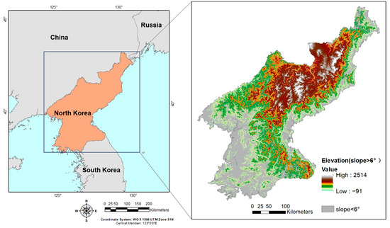 North Korea is located in the north of the Korean Peninsula in East Asia, bordered by China and Russia to the north and South Korea to the south. North Korea covers an area of 123,354 km2 (Figure 1). In total, 64% of the land area is sloping land with a slope greater than 6 degrees. Owing to the long-standing tectonic movements, erosion, and sedimentation, the topography is characterized by mountain areas, plains, valleys, coasts, and plateaus. Mountains with high elevations are concentrated in the north and east, whereas flat fields are mainly distributed on the west and south coasts. In North Korea, forestland and pasture areas have generally decreased and agricultural land, especially farmland on slopes, has increased in most areas. These changes are part of North Korea’s policies, and the proportion of agricultural land is expected to increase until the 2030s.