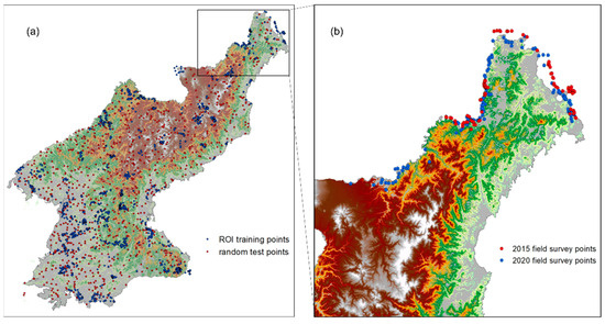 The region of interest (ROI) training and random test points (a) for model training, and field survey points along the Tumen River collected in 2015 and 2020 (b).