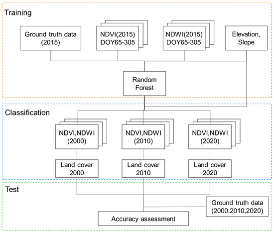 To obtain the phenological characteristics of each type of vegetation, we used the Moderate Resolution Imaging Spectroradiometer (MODIS) MOD13Q1 product acquired from the USGS Earth Explorer. We used the Normalized Difference Vegetation Index (NDVI), band2 (NIR band), and band 7 (MIR band) from the product, which are related to plant growth and soil water, to distinguish the unique growth cycle. Considering the growth cycles of vegetation in North Korea, we used the product from March to October in 2000, 2010, and 2020 (Table 1).